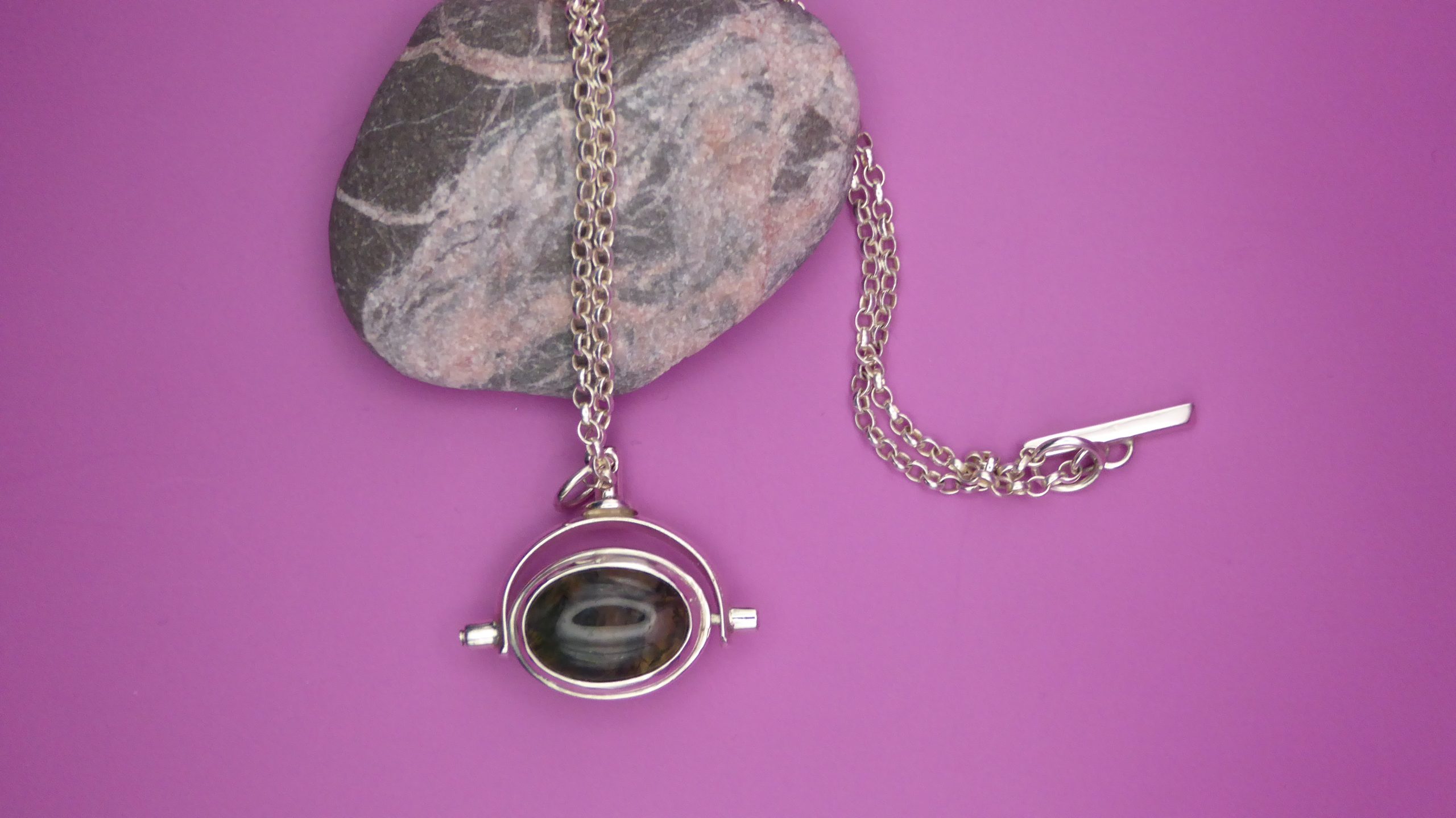 Made for a life-long friend who sadly lost her grandmother’s swivel fob pendant, this weighty pendant has a carnerlian on one side and a moss[…]