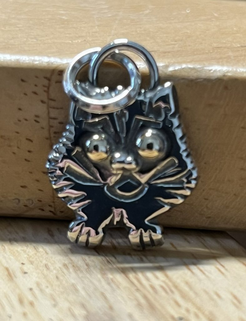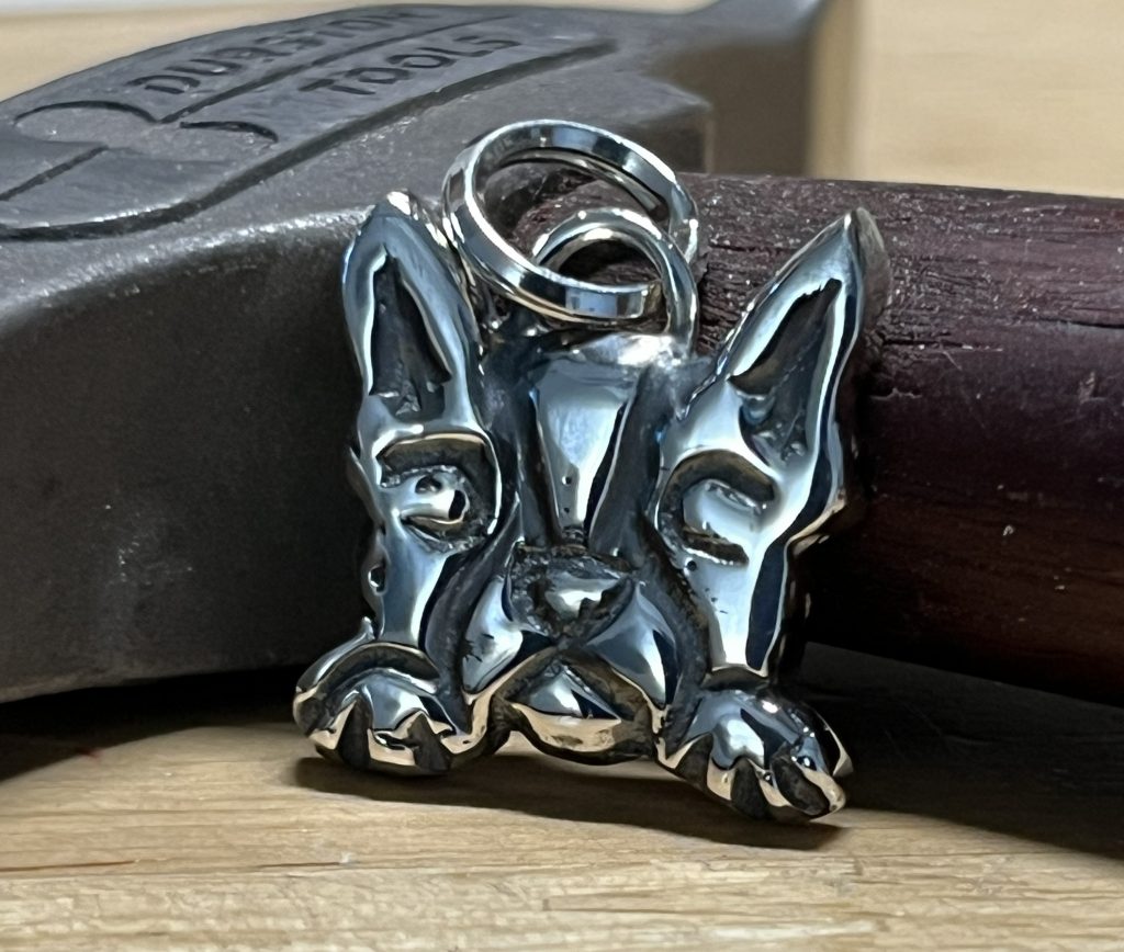 I recently was asked to make a small silver charm of a fluffy cat. Wow – how to make silver sheet into fluffiness?????? So, I carved it in wax and cast it in deft clay and added small bits of gold for the eyes. It worked out quite nicely (a bit cartoonish – but the customer is happy). Customer has a Boston Terrier so just had to do that one too!